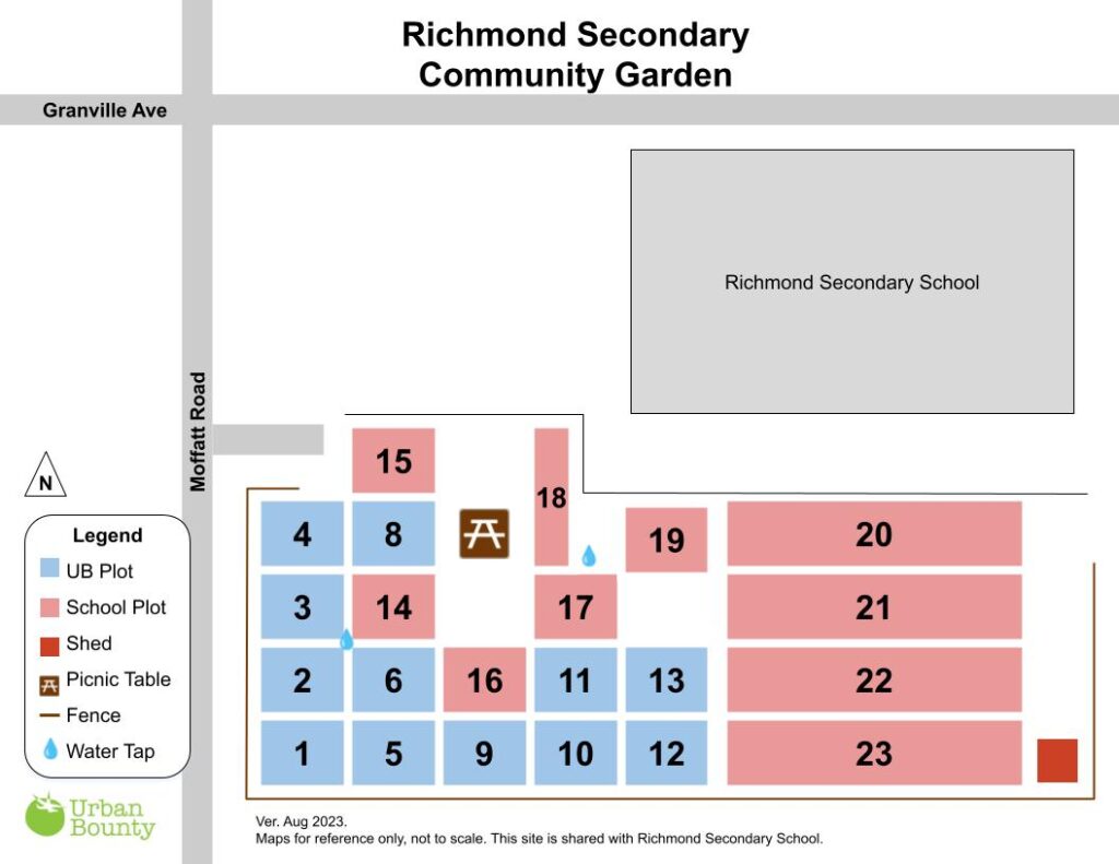 Community garden sites are all provided with gardening tools and water access. This site is shared with Richmond Secondary School and is for seniors only. Tools include: wheelbarrows, shovels, rakes- metal and leaf, and spading forks. Water access is provided from April to October.